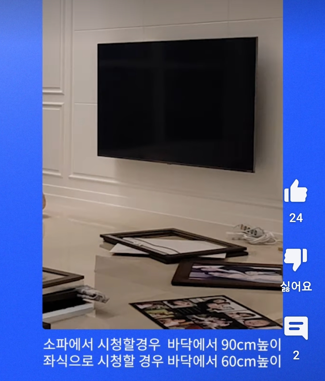 사실 위처럼 유튜브에 벽걸이티비의 설치 높이가 나와있기도 합니다. 위 채널에서는 소파에서 시청시에는 바닥에서 90cm 높이라 벽걸이TV를 설치하라고 하였고, 좌식으로 티비를 볼 때는 바닥으로부터 60cm 높이로 벽걸이TV를 설치하는게 적절하다고 말하고 있습니다. 적당하게 맞는지는 모르겠습니다.